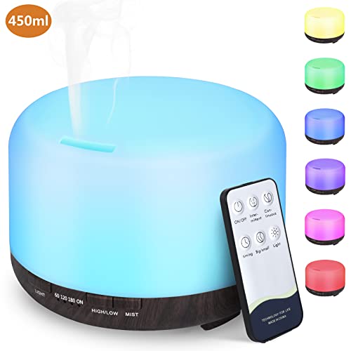 Hianjoo 450 ml Diffusore di Oli Essenziali con Telecomando, Umidificatore Ultrasuoni Diffusore con 7 LED Colori per SPA,Camera da Letto-Regali di grande scelta per Natale e Capodanno(Marrone Scuro)