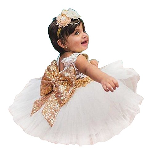 Hibote - Abito da bambina 0-5 anni, con fiocco, paillettes e gonna in tulle bianco bianco 120/4-5years