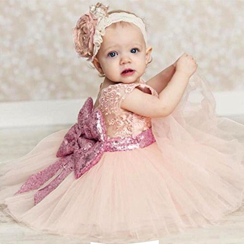 Hibote - Abito da bambina 0-5 anni, con fiocco, paillettes e gonna in tulle rosa Rosa 100/2-3years