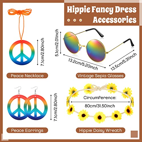 Accessori costume hippie eleganti: anche gli occhiali, le fasce hippie, gli orecchini e le collane sono preparati per te, puoi partecipare a varie feste, come Halloween, feste hippie, feste in discoteca e altre attività, una scelta ideale per partecipare a feste a tema retrò