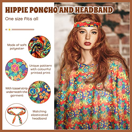 Set costume hippie: otterrai 1 mantello hippie, 1 fascia anni '70 abbinata, 1 ghirlanda fascia crisantemo, 1 collana con segno di pace, 1 paio di orecchini segno di pace e 1 paio di occhiali da sole hippie colorati, questo set può farti catturare l'attenzione