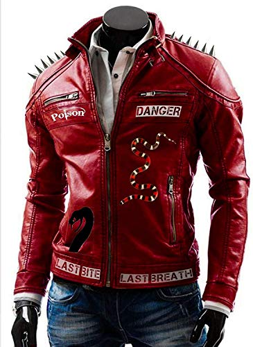 HiFacon Mens Biker I am Venomous Last Bite Last Breath Serpents borchiati Spikes Rosso Brando Vintage Moto Retro Biker Giacca In Pelle Capispalla Rosso - Giacca con borchie L