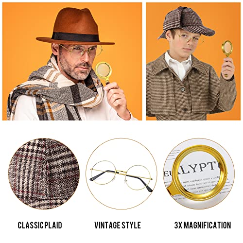 LA CONFEZIONE COMPRENDE - 1 × Lente d'ingrandimento 3x, 1 × Cappello a quadri da cacciatore di cervi, 1 × Occhiali con montatura dorata in stile vittoriano. Vestitevi come un vero detective!