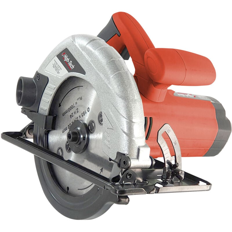 Sega circolare High-Tech professional. con potenza da 1200 W per un taglio di legno fino a 70 mm. Il design compatto consente una facile manipolazione e operatività. Con guida parallela. lama per sega circolare ha in dotazione anche un adattatore di aspirazione per polvere. che permette di eseguire lavori puliti e precisi. High-Tech sega Circolare 1200W 230V/50HZ Diametro Lama 185mm foro 20 mm Giri a vuoto 0-4500 min Max Profondità di taglio: 65mm a 90° Classe di protezione 2