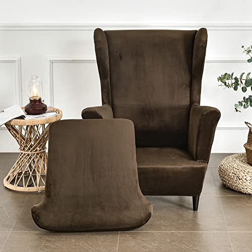 Highdi 2-Pezzi Copripoltrona con Orecchie Elasticizzato, Velluto di Lusso Copridivano con Fodera per Cuscino, Copripoltrona Lavabile Rimovibile per Soggiorno Camera da Letto (Marrone)