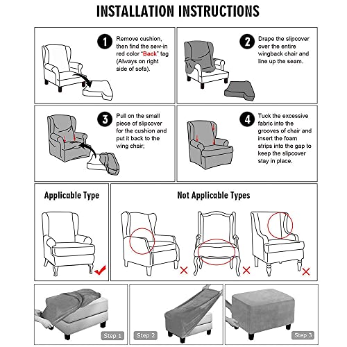 Copriscarpe per sedie Wingback di alta qualità: Questo 2-pezzo di slipcovers wingback è fatto di 92% poliestere e 8% elastan. I coprisedili artigianali sono realizzati in tessuto resistente ed elastico che è stato aggiornato di recente, traspirante, nessun sbiadimento, nessun pilling, liscio e senza rughe, garantendo sia una buona funzionalità che un comfort, proteggere la vostra pelle e voi bambini.