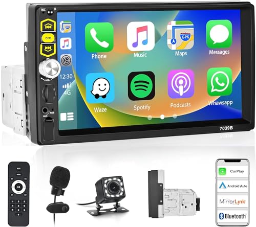 Hikity 1 Din Autoradio Apple Carplay Android Auto 7 Pollici Touch Screen Radio Bluetooth con Schermo Stereo FM/AUX/SD/Mirror Link + Telecamera Posteriore + Microfono