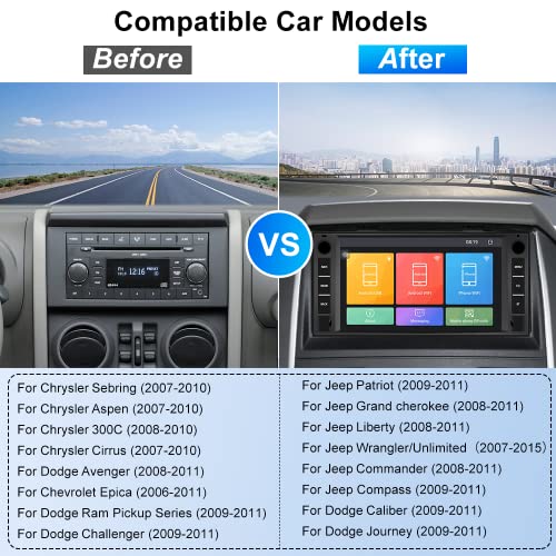 Veicolo Applicabile: Unità principale Android per Jeep Patriot (2009-2011) Jeep Wrangler/Unlimited (2007-2015) Jeep Liberty (2008-2011) Jeep Commander (2008-2011) Jeep Compass (2009-2011) Dodge Ram (2009-2011) Dodge Caliber (2009- 2011) Dodge Journey (2009-2011) Dodge Challenger (2009-2011) Dodge Avenger (2009-2011) Grand Cherokee (2005-2011) Chrysler Sebring (2007-2010) Chrysler Aspen (2007-2010) Chrysler 300C (2007-2010) Chrysler Cirrus (2007-2010).