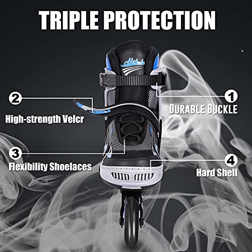【Sicurezza】 Tre protezioni: Potente velcro, passante esterno per pattini in linea e corda per scarpe per sostenere la caviglia. Il piede destro è il freno iniziale, che si può regolare a proprio piacimento per non spaventarsi quando si scivola ad alta velocità.