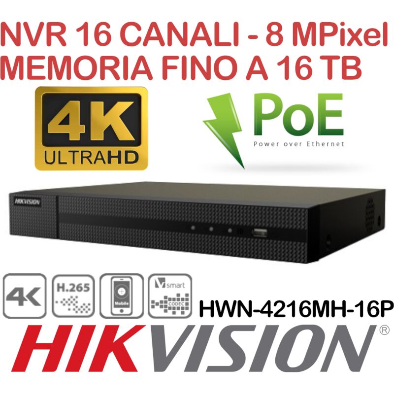 Tale tecnologia permette di risparmiare fino al 50% sugli spazi di archiviazione e sul consumo del traffico dati nella visione da remoto, rispetto alla precedente compressione H.264. Il menu è stato progettato per consentire a tutti, anche gli utenti principianti, di navigare ed effettuare modifiche delle impostazioni del registratore. Il DVR offre connettività da qualsiasi dispositivo inclusi applicazioni per Windows, Mac, iphone e Android. Sistema di video-sicurezza ideale per una vasta gamma di applicazioni: dalle aziende alle amministrazioni pubbliche, dai parchi alle sedi istituzionali, dai musei agli aeroporti, dalle ville ai piccoli contesti condominiali ecc... Videoregistratore NVR digitale IP 16CH canali con switch integrato a 16 ports poe+ Hikvision sku. HWN-4216MH Hiwatch series risoluzione Ultra HD 4K (banda in entrata 80Mbps) con tecnologia di compressione video H.265+, protocollo di compatibilità (multi-brand) Onivf e sistema di configurazione facilitata P2P QR scan con