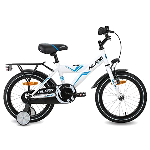 HILAND Bicicletta per Bambini 16/18 Pollici per Ragazzo e Ragazza 4 5 6 7 8 Anni, Bici con Sedile Posteriore/Portapacchi, Freno a Mano e Contropedale, Bianco/Blu/Nero