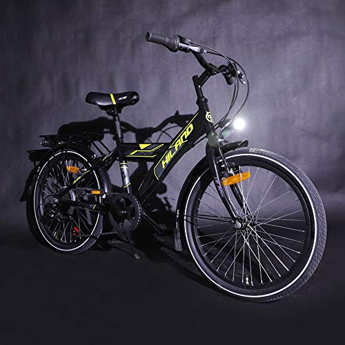 Hiland Rocket Mountain Bike per Bambini da 7 8 9 10 Anni con cambio Shimano Twist Grip Shift a 6 Velocità, Illuminazione secondo STVO, Portapacchi e Supporto in Alluminio Nero