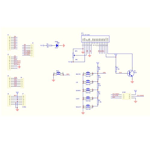 Include un display LCD 2x16 e 6 pulsanti temporanei che consentono di spostarsi tra i menu e effettuare selezioni direttamente da una scheda collegata al progetto Arduino.