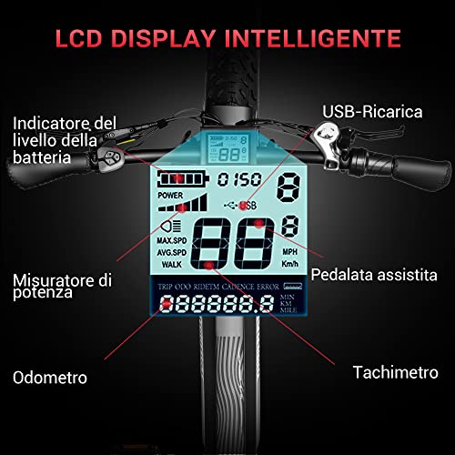 【SISTEMA DI SOSPENSIONE COMPLETO E FRENAGGIO】l'e-bike adotta un eccellente telaio in 6061 lega di alluminio. Le biciclette elettriche per adulti utilizzano la forcella ammortizzata anteriore, La sospensione aggiornata è dotata di un blocco che ti consente di bloccarla su strade pianeggianti per una guida veloce e sbloccarla su terreni accidentati per una guida
