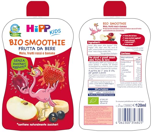 HiPP - Smoothie Bio per Bambini, Purea 100% Frutta al Gusto Mela, Frutti Rossi e Banana, Senza Zuccheri Aggiunti, 6 Confezioni da 120 ml