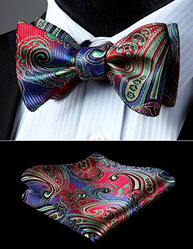 HISDERN Uomo Stampa floreale cummerbund & Self Bowtie & Pocket Square Set Rosso/Viola/Verde
