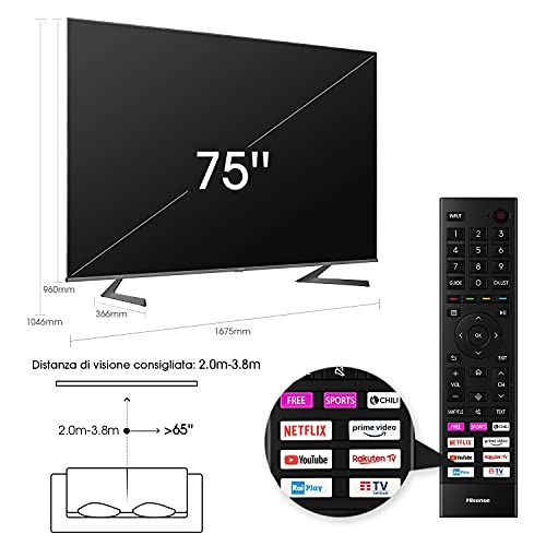 Hisense 75" QLED 4K 75A78GQ, Quantum Dot, Smart TV VIDAA, HDR Dolby Vision, Audio Dolby Atmos, Controlli vocali Alexa, Google Assistant, Tuner DVB-T2/S2 HEVC 10, Nero