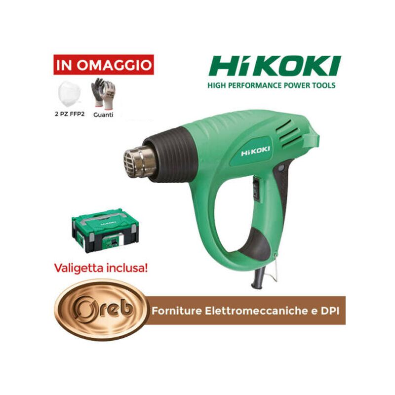 Termosoffiatore Hitachi RH600T da 2.000 W con kit accessori in valigetta Caratteristiche: Potente e pratico termosoffiatore da 2.000 W. Dotato di selettore a 2 posizioni per selezionare la temperatura e la velocità del flusso aria. E' dotato inoltre di un pulsante che consente un veloce raffreddamento della macchina stessa. Applicazioni: Utile e pratico per operazioni di formatura, termorestrizione, rimozione pitture, saldatura ed indurimento. Potenza assorbita: 2000 W Capacità flusso aria I / II 0,25 / 0,50 m³/min Temperatura flusso aria I / II 450 / 600°C °C Colpo di raffreddamento veloce 50 °C Lunghezza: 245 mm. Larghezza: 83 mm Peso: 0.6 Kg. Dotazioni: ugello tondo - ugello piatto - ugello curvo - ugello con protezione vetro - raschietto - valigetta Effettuare un acquisto presso il nostro negozio significa garantirsi un prodotto con o . La fattura va richiesta subito dopo l´acquisto comunicandoci tutti i dati societari via e-mail all´indirizzo o attraverso messaggio La spedizione