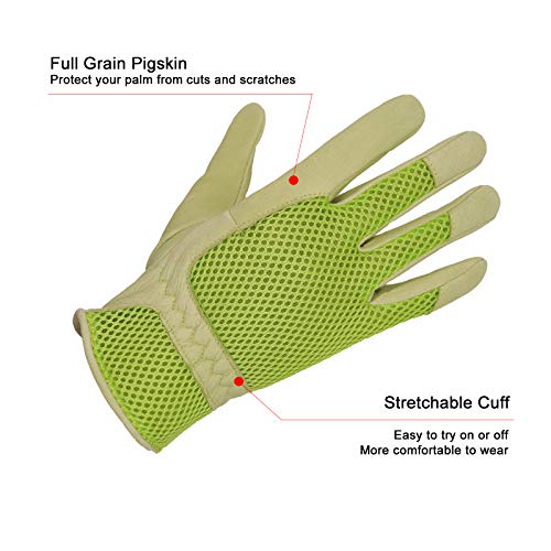 HLDD HANDLANDY Guanti da giardinaggio da donna in pelle di maiale, guanti da lavoro elastici e resistenti, maglia 3D, vestibilità comoda, design confortevole e traspirante, per roseto (M, verde)