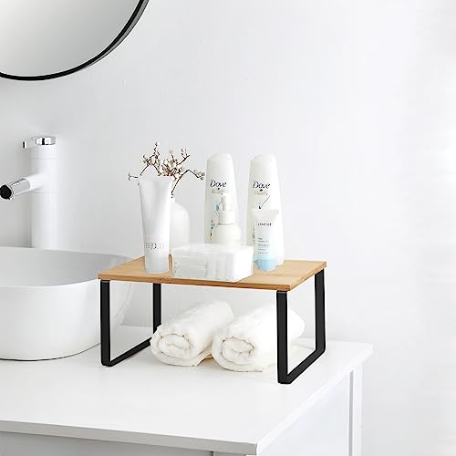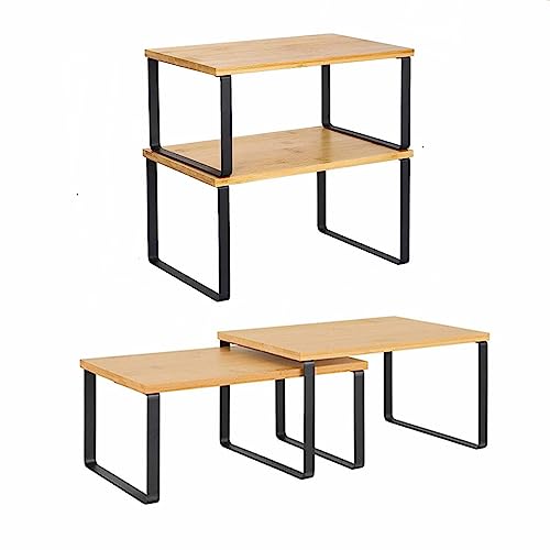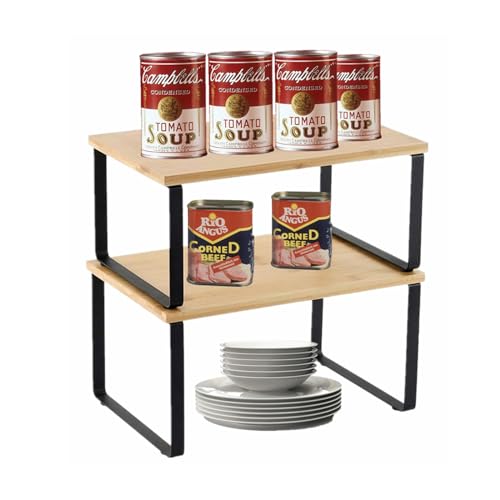 HMRACK Scaffale Ripiani Cucina Salvaspazio,Set da 2 Ripiani Espandibili in Bambù, Organizer Versatile con Portaspezie - Facile da Assemblare,Ottimizza lo Spazio in Cucina