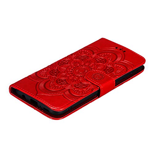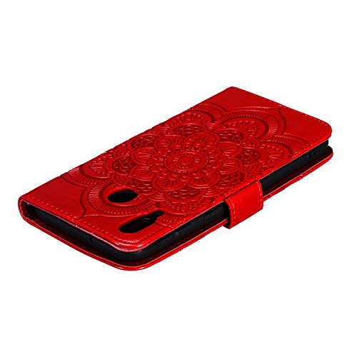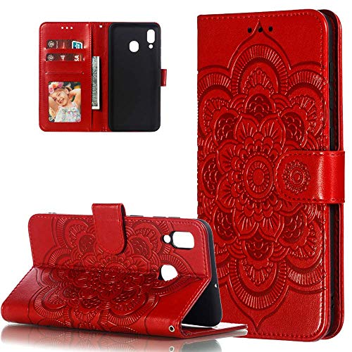 HMTECH Galaxy A30 Custodia Cover Portafoglio,Samsung Galaxy A20 Custodia Fiore di Mandala in Rilievo Wallet Shock-Absorption Magnetica Supporto Protettiva Bumper Leather Flip Cover,LD Mandala Red