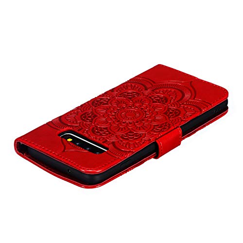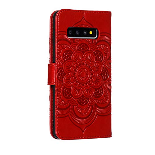 HMTECH Galaxy S10 Plus Custodia Cover Portafoglio,Samsung Galaxy S10 Plus Custodia Fiore di Mandala in Rilievo Wallet Shock-Absorption Magnetica Supporto Bumper Leather Flip Cover,LD Mandala Red