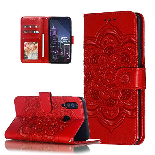 HMTECH Moto E6 Plus Custodia Cover Portafoglio,Motorola Moto E6 Plus Custodia Fiore di mandala in rilievo Wallet Shock-Absorption Magnetica Supporto Protettiva Bumper Leather Flip Cover,LD Mandala Red