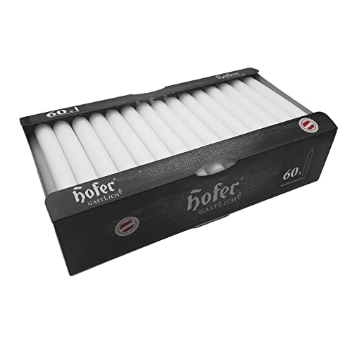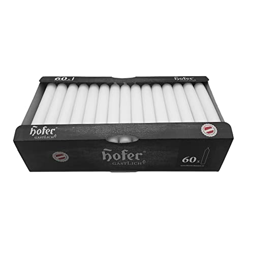 Hofer Candele lunghe da tavola, set da 60 pezzi (1 x 60), dim. 21,5 x 180 mm, colore bianco, lunga durata circa 5 ore, set di 60 candele a punta in cera antigoccia, prodotto in Austria