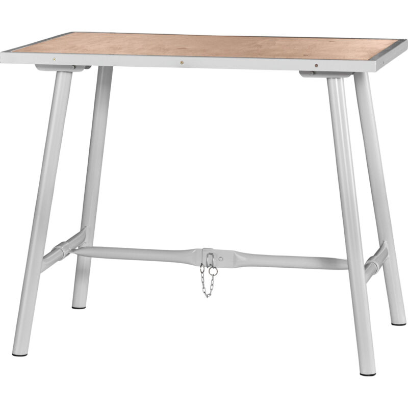 Robusto pannello indeformabile multiplex, incollato, impermeabile all'acqua. Con paraspigoli in metallo (antiurto e antischeggia). Struttura portante in tubi di acciaio con controventatura. Il banco da lavoro si può ripiegare per il trasporto. Verniciatura: Grigio chiaro RAL 7035, termoverniciato. Verniciature speciali non disponibili. Dati tecnici Tipo di prodotto Banco da lavoro richiudibile Peso, kg 36 Lunghezza piano di lavoro, mm 1.000 Profondità piano di lavoro, mm 700 Spessore piano di lavoro, mm 30 Altezza banco da lavoro, mm 820 Portata, kg 450