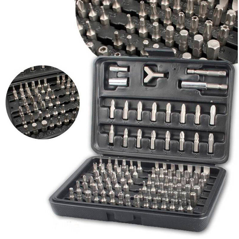 Set di punte da 100 pezzi con valigetta: 1 adattatore per punte, 1 cacciavite a gancio, 1 supporto per magnete, 12 punte esagonali con diametro interno di 2 / 2,5 / 3/4/5/6 mm - 5 / 64-3 / 32-7 / 64-1 / 8-9 / 64-5 / 32, 19 punte esagonali da 1.5 / 2 / 2 / 2,5 / 3/4/5 / 5,5 / 6/8 mm - 1 / 16-5 / 64-3 / 32-7 / 64-1 / 8-9 / 64-5 / 32-3 / 16-7 / 32-1 / 4, 2 adattatori 25/50mm, 3 punte di serraggio gr.1/2/3, 3 punte multidentate m5/m6/m8, 4 punte per viti con impronta a croce gr.8/06/10, 4 punte per viti a tre alette gr.1/2/3/4, 4 punte per viti di sicurezza gr.4/6/8/10mm, 4 punte quadrate gr.0/1/2/3, 8 punte a croce ph gr.0/1/2/3, 8 punte a croce pz gr.0/1/2/3, 9 punte con profilo a T t8/t10/t15/t20/t25/t27/t30/t40/t45 e 9 punte con intaglio 3/4 / 4,5 / 5 / 5 / 5,5 / 6 / 6,5 / 7/8 mm.