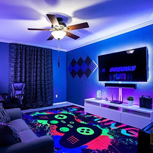 LUMINOSO/REATTIVO AI RAGGI UV: Il nostro tappeto da gioco presenta un motivo di controller di gioco in uno sbalorditivo 3D, rendendolo un punto focale accattivante. Le fibre reattive ai raggi UV assorbono la luce nera, trasformando il tuo spazio in un mondo diverso, migliorando la tua esperienza di gioco