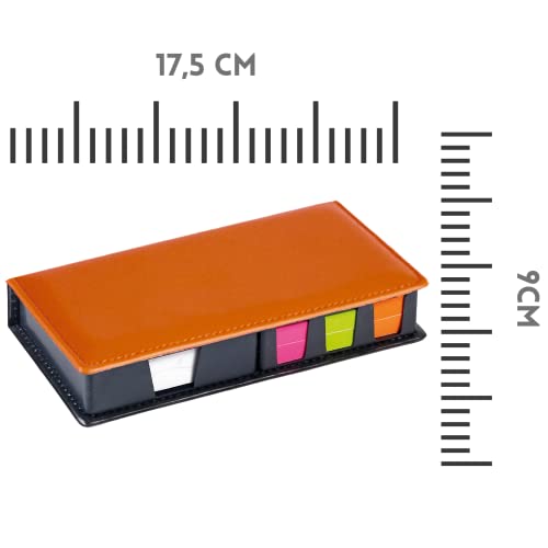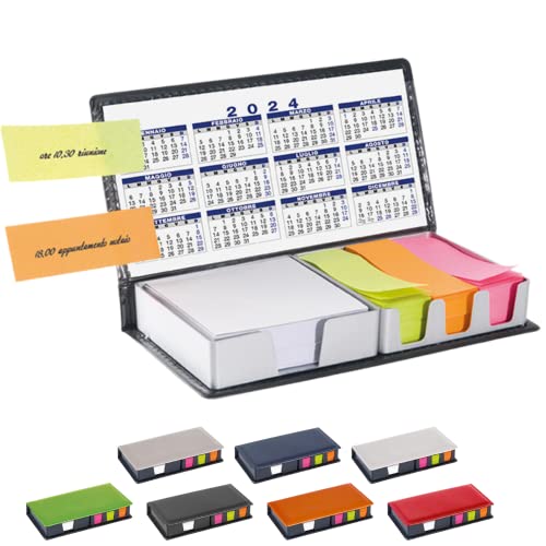 [ IL PRODOTTO ] Misura complessiva da cm 17,5xh3x9 c.a. rigido con 3 vani contenenti foglietti colorati adesivi ed 1 vano con foglietti bianchi per appunti non adesivi. Coperchio in ecopelle che ospita la stampa lungo tutta la superficie.