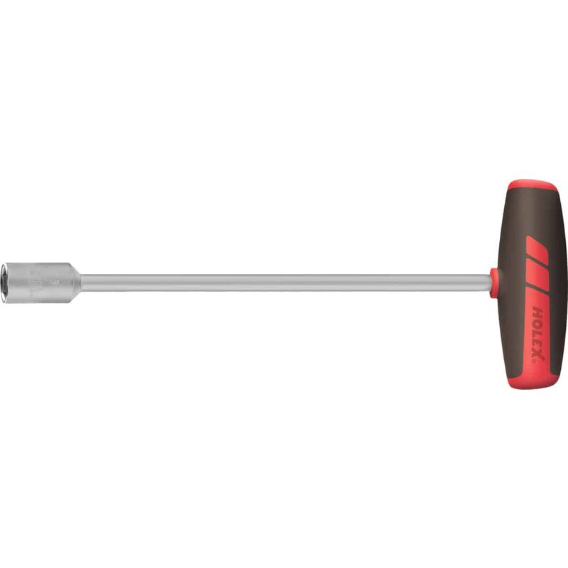 Impugnatura a T di forma ergonomica con superficie antiscivolo in Santoprene® e nocciolo in plastica antiurto. Lama in acciaio speciale al cromo-vanadio. Superficie cromata. Impugnatura a T in plastica resistente agli urti. Lama in acciaio speciale al vanadio, superficie cromata opaca. Nota: Giravite per chiavi a bussola HOLEX con impugnatura a T disponibile anche con dimensioni in pollici sul nostro eShop (n. art. 622732). Dati tecnici Tipo di prodotto Chiave a bussola Lunghezza complessiva, mm 262 Apertura, mm 13 Lunghezza lama, mm 230