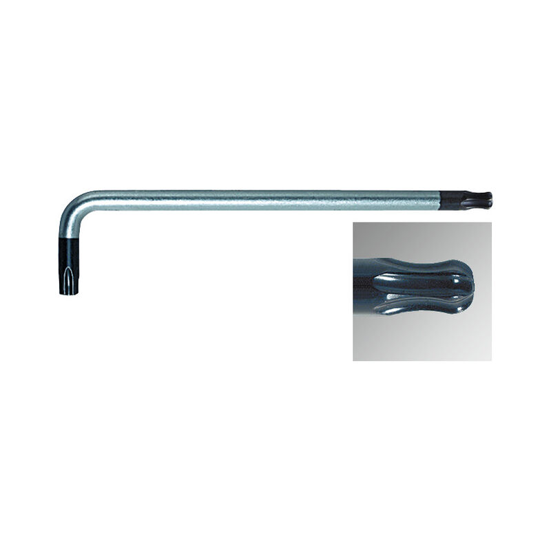Gambo piegato a gomito, interamente temprato (tenace). Fianco lungo con testa sferoidale, per uso inclinato fino a 25°. Materiale: Acciaio al cromo-vanadio, esecuzione cromata. Punte brunite. Dati tecnici Testa sferoidale sul fianco lungo sì Materiale Acciaio al cromo-vanadio Esecuzione codolo piegate a gomito Punta di precisione nero Profilo di manovra Giraviti per viti con impronta Torx® Superficie esecuzione cromata Tipo di prodotto Giravite Impronta Torx® TX27 Lunghezze dei fianchi, mm 106×20