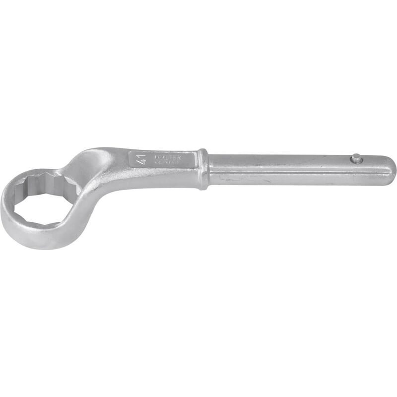 Forgiate, esecuzione pesante, piegate a circa 80°. Spina elastica di arresto per leva di manovra n. 618600 / 618610. Materiale: Acciaio al cromo-vanadio, cromato. Dati tecnici Materiale Acciaio al cromo-vanadio Superficie cromato Tipo di prodotto Chiave Apertura, mm 65 Lunghezza chiave, mm 355 ⌀ Anello D, mm 98