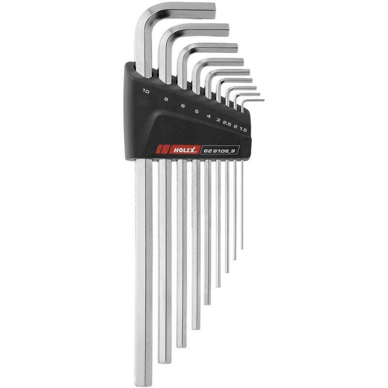 10 Conservazione in: Supporto in plastica Nota: Chiavi maschio piegate HOLEX disponibili anche con dimensioni in pollici sul nostro eShop (n. art. 626108 e n. art. 626128). Dati tecnici Tipo di prodotto Giravite Numero di giraviti 9