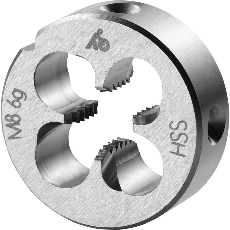 Forma chiusa preincisa. ≥ M3 con imbocco corretto su entrambi i lati per agevolare l'esecuzione del filetto ed evacuare correttamente i trucioli nella direzione di taglio. Imbocco a 1 spira e 3/4. Dati tecnici Acciaio < 750 N/mm² m/min idoneo Alluminio (a truciolo corto) m/min limitatamente adatto Acciaio < 500 N/mm² m/min idoneo Olio idoneo Materiale da taglio HSS a secco limitatamente adatto Tipo di prodotto Filiere Norma EN 22568 Tipo di filettatura M Angolo di filetto Grad 60 Direzione di taglio destra Misura del filetto M8 Classe di tolleranza DIN 13 6g Passo, mm 1,25 Altezza, mm 9 ⌀ Esterno, mm 25