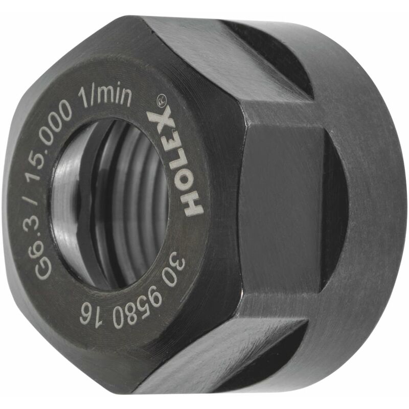 Filettatura e cono rettificati in un'unica operazione per massima precisione di rotazione concentrica. Con esagono SW 25. Per: Tutti mandrini a pinza ER standard. Accessori speciali: Chiave di serraggio ER n. art. 309680 − 309740. Chiave non riutilizzabile (per Dim. 16), n. art. 613300 Dim. 25. Nota: Mandrino e ghiera di serraggio sono equilibrati separatamente! Dati tecnici Qualità equilibratura G con numero di giri G 6,3 con 15000 min-1 Norma DIN 6499 D Tipo di prodotto Ghiera Filettatura M22×1,5 Lunghezza complessiva L, mm 18 Coppia di serraggio massimo, N·m 80 Per ER, mm 16 ⌀ Esterno D, mm 28
