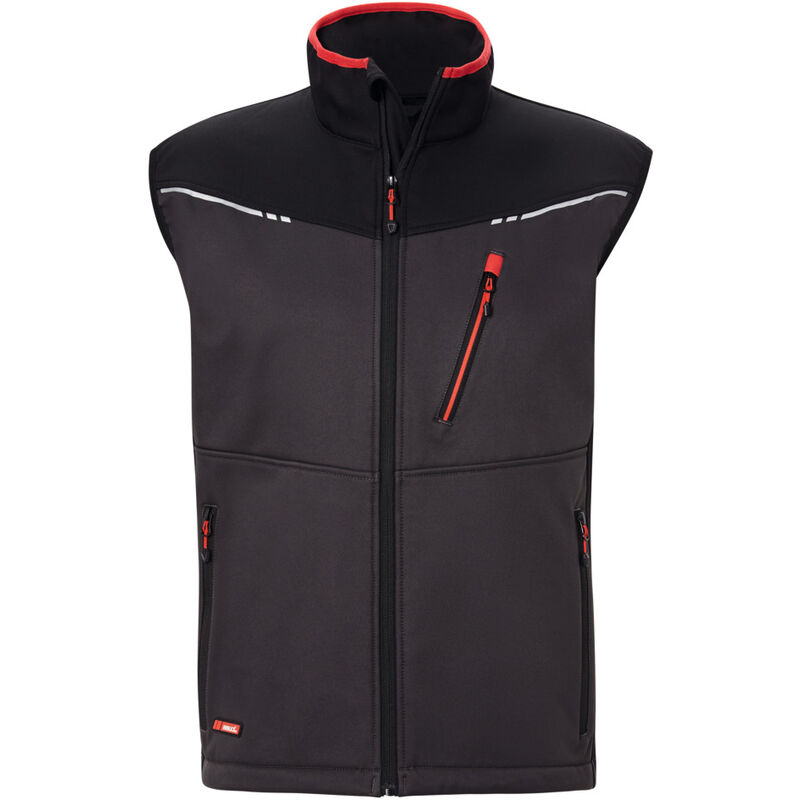 Dettagli riflettenti su petto e dorso per offrire una migliore visibilità. Con robusta chiusura lampo anteriore e pratiche tasche sul petto e sui fianchi. Pratico gilet in Softshell, che protegge efficacemente il corpo dal vento e dalla pioggia leggera. Dati tecnici Composizione del tessuto 100% poliestere Grammatura del materiale / spessore del tessuto g/m2 320 Colore grigio scuro / nero /rosso Tipo di prodotto Giacca in softshell Lavaggio Colorati 40 °C Serie Workwear Taglia unisex 2XL