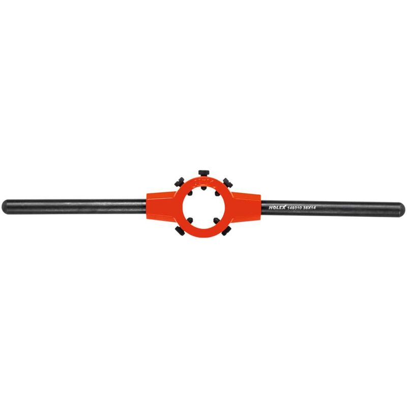 Impugnature in acciaio svitabili. Con 5 viti per fissare la filiera. Fino alla Dim. 65×25 in lega di zinco. Da Dim. 75×20 in acciaio. Uso: Per il montaggio diretto di filiere chiuse e preincise a norma EN 22568. Dati tecnici Tipo di prodotto Portafiliere Norma EN 22568 Numero di viti di fissaggio 5 Altezza, mm 30 Lunghezza complessiva, mm 700 Per filiera di ⌀, mm 75