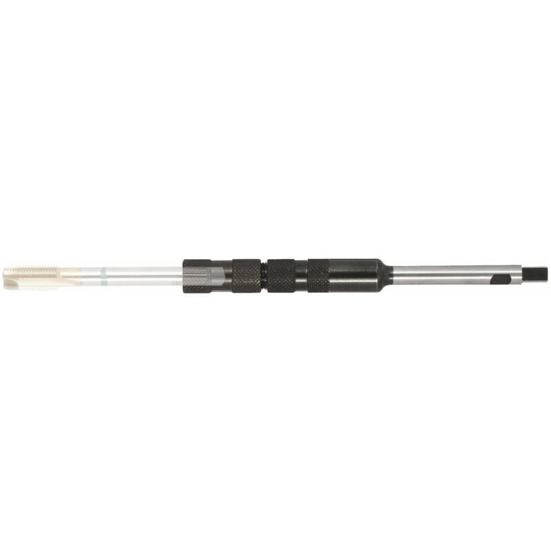 DescrizioneEsecuzione:Versione con esecuzione lunga o extralunga.L'estremità anteriore della prolunga è a forma di pinza di serraggio. Serrando manualmente la ghiera di serraggio zigrinata, la pinza di serraggio viene bloccata con il maschio a filettare.La trasmissione della coppia avviene attraverso il quadro.L'estremità posteriore della prolunga è conforme alla norma DIN, pertanto la prolunga può essere alloggiata in bussole a innesto rapido per maschi a filettare o in pinze ER per maschi a filettare con quadro.h6-Codolo con superficie Weldon per attacco anche in mandrini Weldon/portautensili o idraulici.Uso:Per la filettatura in punti di difficile accesso, come peres. incavi profondi, gradini, bordi su dispositivi, filettature interne poste in profondità o direttamente su pareti in ghisa.Nota:Pinza di serraggio esagonale alternativa per il fissaggio del maschio a filettare disponibile su richiesta.Dati tenici per ⌀ nominale filettatura d1 DIN 374/376 M22 − M24 per ⌀ codolo