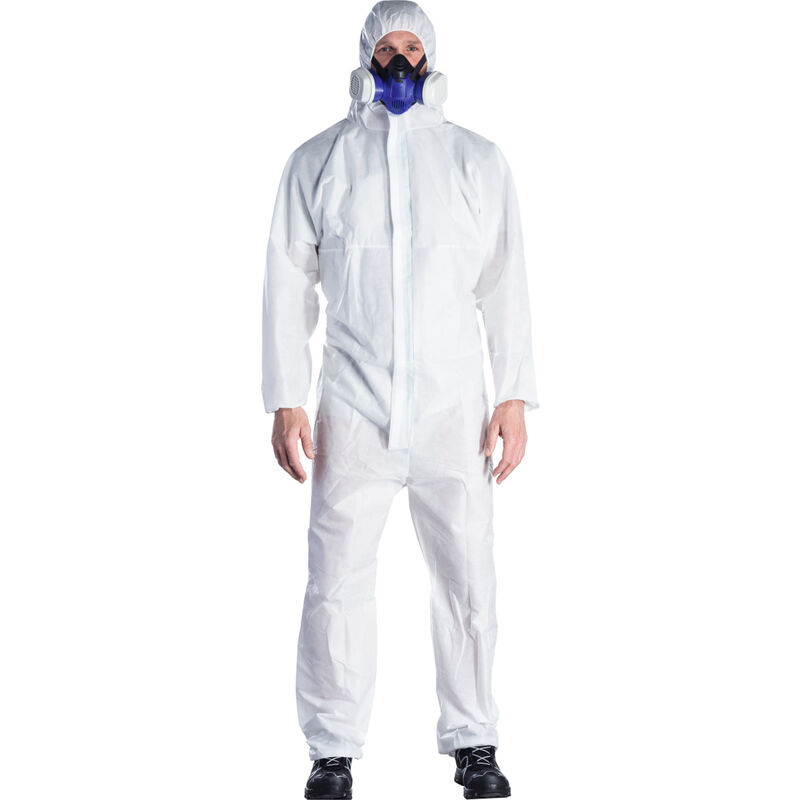 Tuta da lavoro monouso antistatica in materiale SMS traspirante. 45 g/m2. Cappuccio, cinturino dei pantaloni e polsini elasticizzati. Buona vestibilità per una libertà di movimento e un comfort notevoli. Per lo smaltimento dell'amianto, la lavorazione dei metalli e i lavori di verniciatura. Tuta da lavoro (categoria DPI III) tipo 5/6. Sistema di chiusura lampo autoadesivo per una maggiore tenuta. Norma: * EN 13982-1 Typ 5 * EN 13034 Typ 6 * EN 1149-5 Dati tecnici Colore bianco Tipo di prodotto Tuta per la protezione da sostanze chimiche Genere Unisex Taglia unisex 2XL