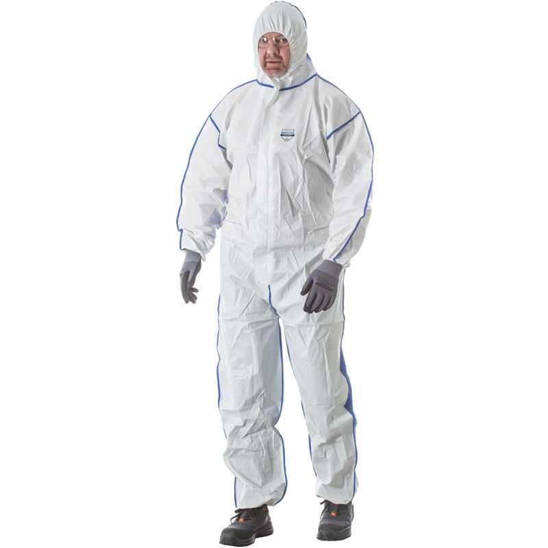 Tuta da lavoro monouso antistatica in polipropilene e polietilene. 65 g/m2. Con materiale SMS (55 g/m2) sulla schiena per favorire la traspirabilità. Cappuccio, cinturino dei pantaloni e polsini elasticizzati. Chiusura lampo frontale. Cuciture incollate. Tuta di protezione contro nebulizzazioni, schizzi d'acqua, particelle solide radioattive, agenti chimici liquidi e agenti infettivi. Tuta da lavoro (DPI di III categoria) Tipo 5/6. Sistema di chiusura lampo con nastro autoadesivo per una maggiore tenuta. Norma: * EN 13982-1 Typ 5 * EN 13034 Typ 6 * EN 1073-2 * EN 1149-5 Dati tecnici Tipo di prodotto Tuta per la protezione da sostanze chimiche Colore bianco / blu Abbigliamento a norma DIN EN ISO 1149 Caratteristiche antistatiche Genere Unisex Taglia unisex 3XL