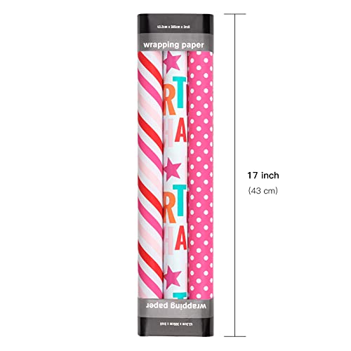 ROTOLO CORTO: Questo set di carta da regalo per compleanno viene fornito con 3 rotoli, ogni rotolo misura 17 pollici (43,2 cm) di larghezza e 120 pollici (305 cm) di lunghezza, per un totale di 42,5 piedi quadrati di carta, è adatto per regali MEDI e PICCOLI. Si prega di confermare se si adatta alle dimensioni del regalo prima di ordinare.