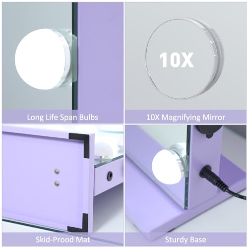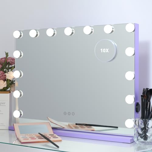 OUO Hollywood - Specchio da trucco illuminato con 15 lampadine LED dimmerabili, specchio cosmetico con porta USB, montaggio da tavolo o a parete, 58 x 46 cm, colore: Viola