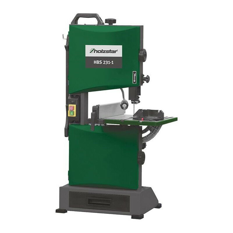 Sega a nastro per legno HBS 231-1 - Alloggiamento in lamiera d'acciaio - Piano di lavoro in ghisa con superficie rettificata - Guida longitudinale in alluminio con eccentrico e scala di di bloccaggio rapido e scala - Piano sega inclinabile con scala angolare - Volani in alluminio pressofuso con cuscinetti di precisione e rivestimenti speciali - Con guida lama a 3 rulli di precisione in alto e in basso - Interruttore di sicurezza Fornito: Con lama. Guida longitudinale e angolare. Luce di lavoro a LED e asta di spinta.
