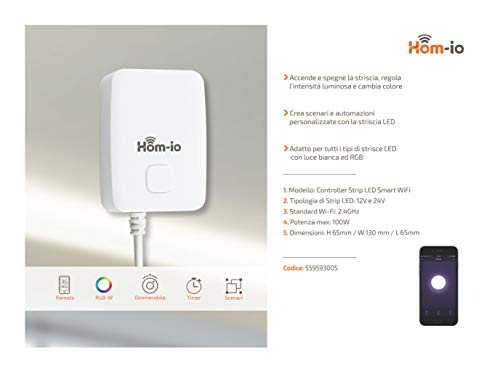 Compatibilità: Questo controller è pienamente compatibile con assistenti vocali come Alexa e Google Home, consentendoti di controllare le luci con semplici comandi vocali. Grazie all'applicazione Hom-Io, puoi gestire la tua striscia LED in modo intelligente e personalizzato direttamente dal tuo smartphone.