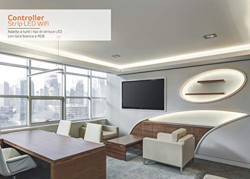 CARATTERISTICHE: Tipologia di Strip LED: 12V e 24V | Standard Wi-Fi: 2.4GHz | Potenza max: 100W | Dimensioni: 65 x 130 x 65 mm | Fornito con un pratico adattatore universale per il collegamento delle strisce al metro.