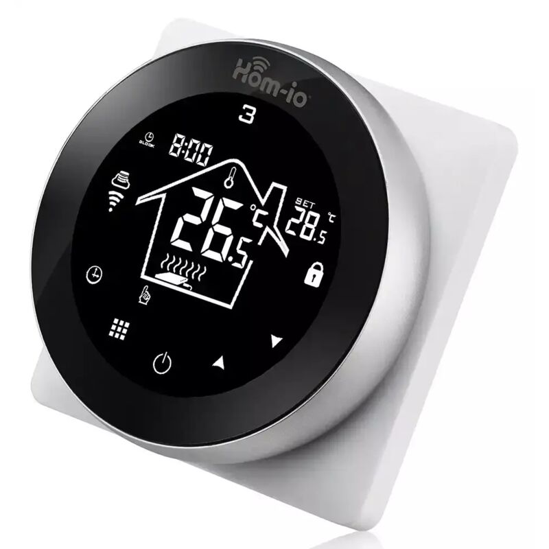 Cronotermostato WiFi Hom-io versione Plus con adattatore scatola 503 incluso. Nuovo ampio display migliorato nella luminosità e nell'angolo di visione, completamente touch screen e con accessorio di montaggio a parete incluso nella confezione. Alimentazione: 90-240Vac 50/60HZ 1. Visualizzazione della temperatura: 0~40° C 2. Precisione di visualizzazione: 0,5° C 3. Sensore sonda: NTC (10k) 1% 4. Programmazione: settimanale ciclico 5. Capacità di contatto: 3A/250V (WW) 6. Installazione: a parete, incasso 7. Dimensioni: H 100mm / 8. W 100 mm / L 65mm 9. Kit di montaggio scatola 503 incluso. Ampio display LCD migliorato nella luminosità e nell'angolo di visione, completamente touch screen ad alta risoluzione, controllo offline in modalità automatica o manuale. Programmabile settimanale in combinazione 5+2, 6+1, 7 giorni, da app o direttamente tramite tasti sul pannello. GLI INCREMENTI DI 0,5 °C CONSENTONO UNA REGOLAZIONE PRECISA DELLA TEMPERATURA IMPOSTATA, IL BLOCCO DI SICUREZZA EVITA