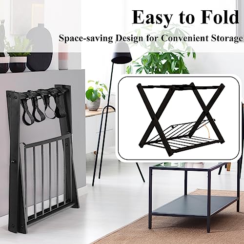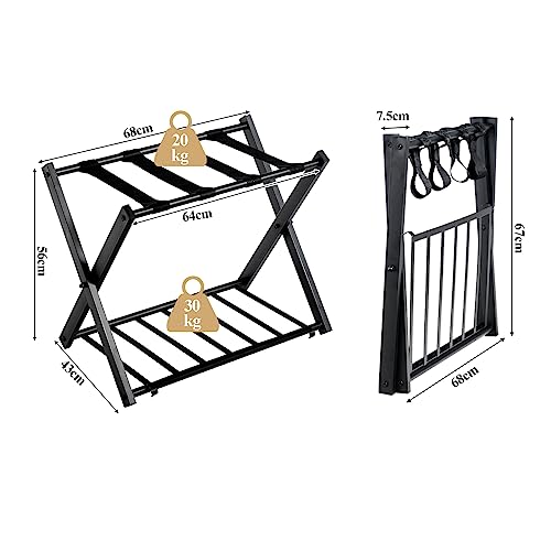 HOMASIS Portavaligie Pieghevole, Sgabelli Reggivaligia in Metallo, Supporto per Valigie e Borsoni con Mensola, Portascarpe, Porta Valigie da Camera Hotel, 68 x 43 x 56 (Nero)